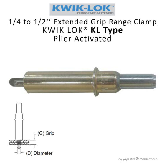The KL-type cleco is a standard K-type clamp with an extended grip range. It is pliers-actuated cleco, spring loaded, and steel bodied; it is effective for most space requirements.